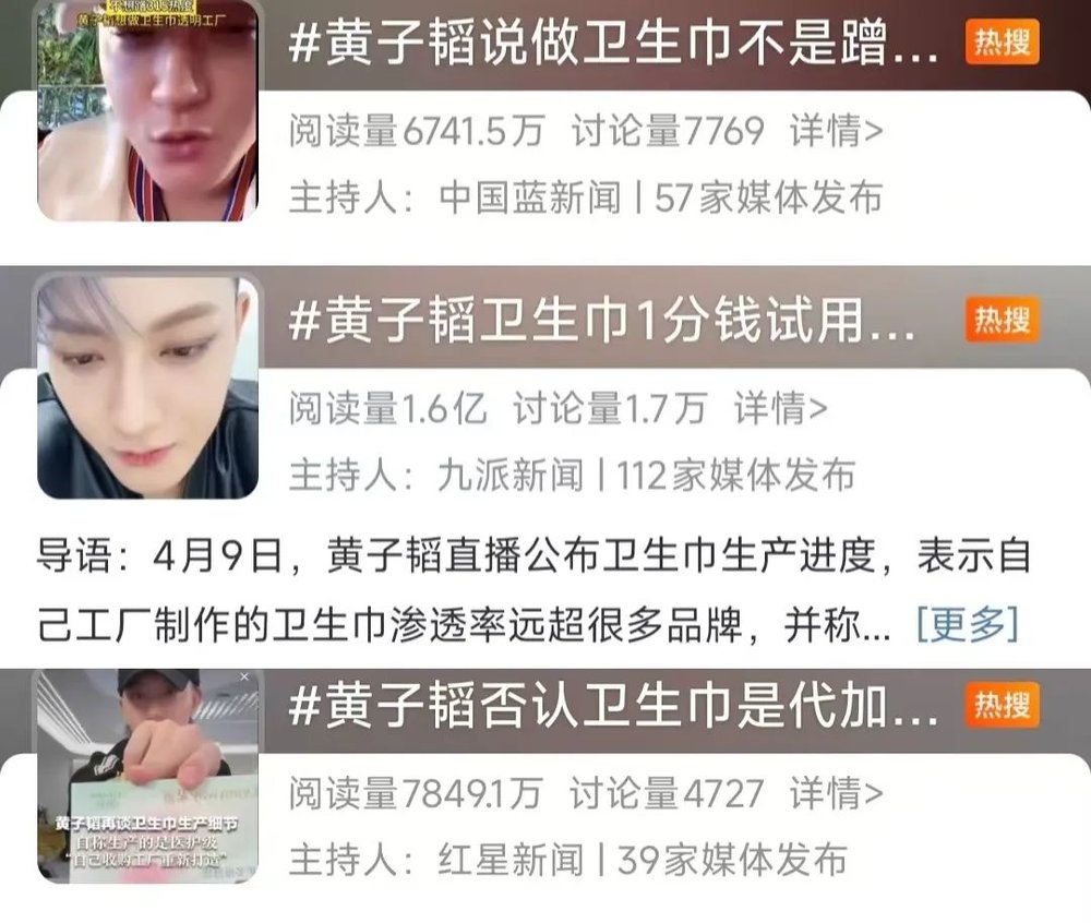 在直播送卫生巾之后,#黄子韬否认卫生巾是代加工#黄子韬说做卫生不是蹭315热度 #黄子韬卫生巾1分钟试用5万单#冲上微博热搜。