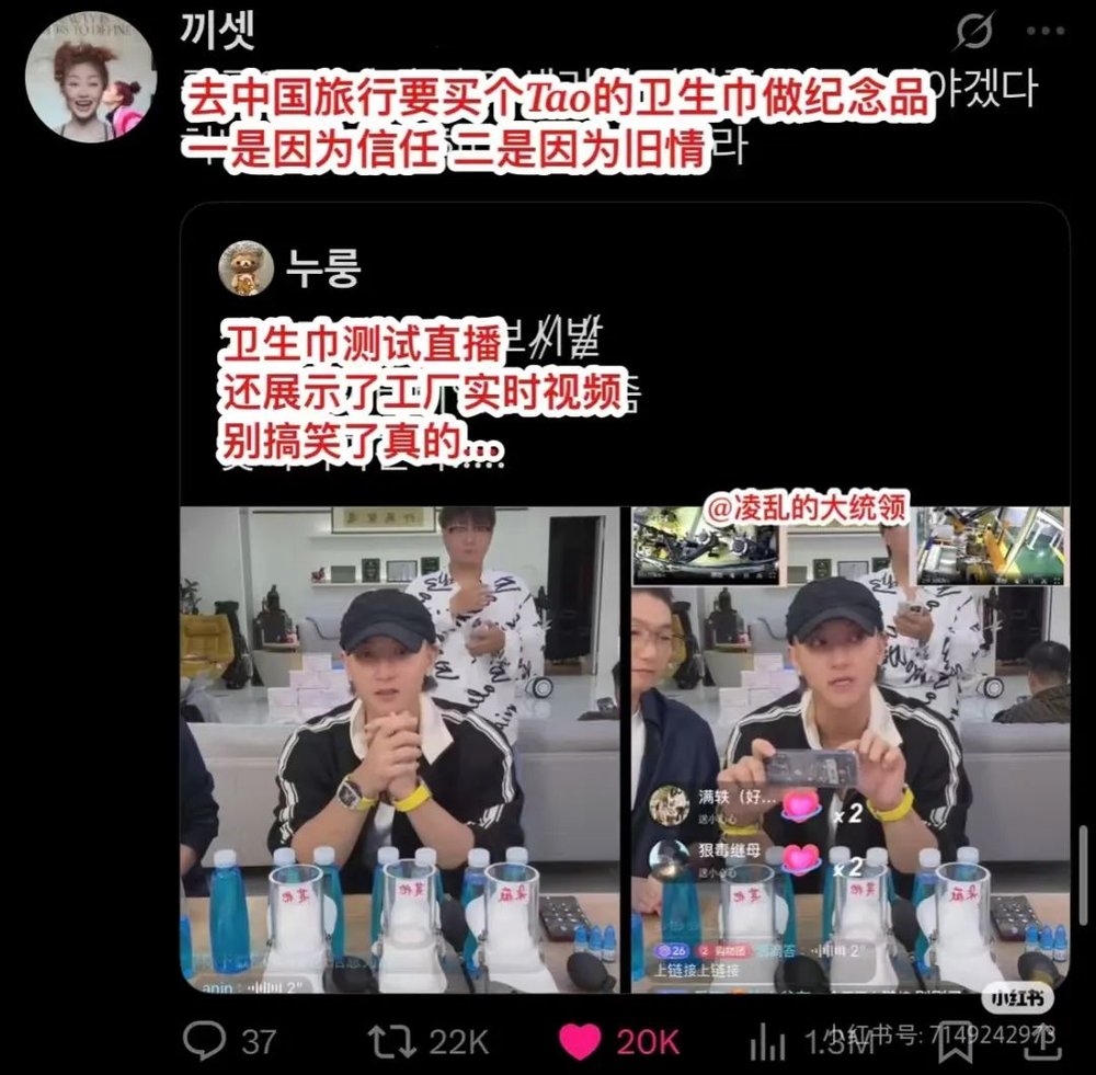 一派是坚定的黄子韬死忠粉,从idol时期便追随其左右的粉丝们把卫生巾当成idol周边买。“去中国旅行要买个Tao的卫生巾做纪念品,一是因为信任,二是因为旧情。”有黄子韬韩国粉丝在社交媒体上为其发声。