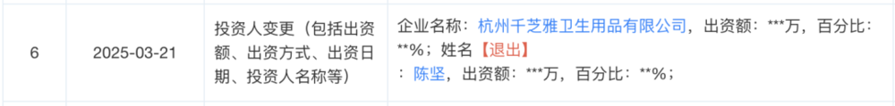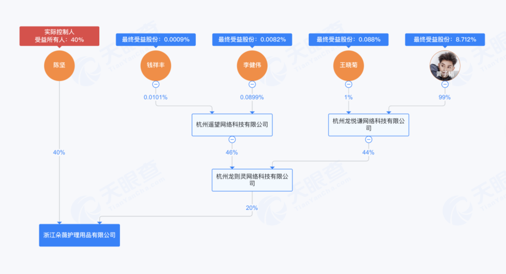 最近一次变更记录显示,2025年4月,浙江朵薇护理用品有限公司新增杭州龙则灵网络科技有限公司为股东,黄子韬通过名下杭州龙悦谦网络科技有限公司间接持有该公司44%的股份。
