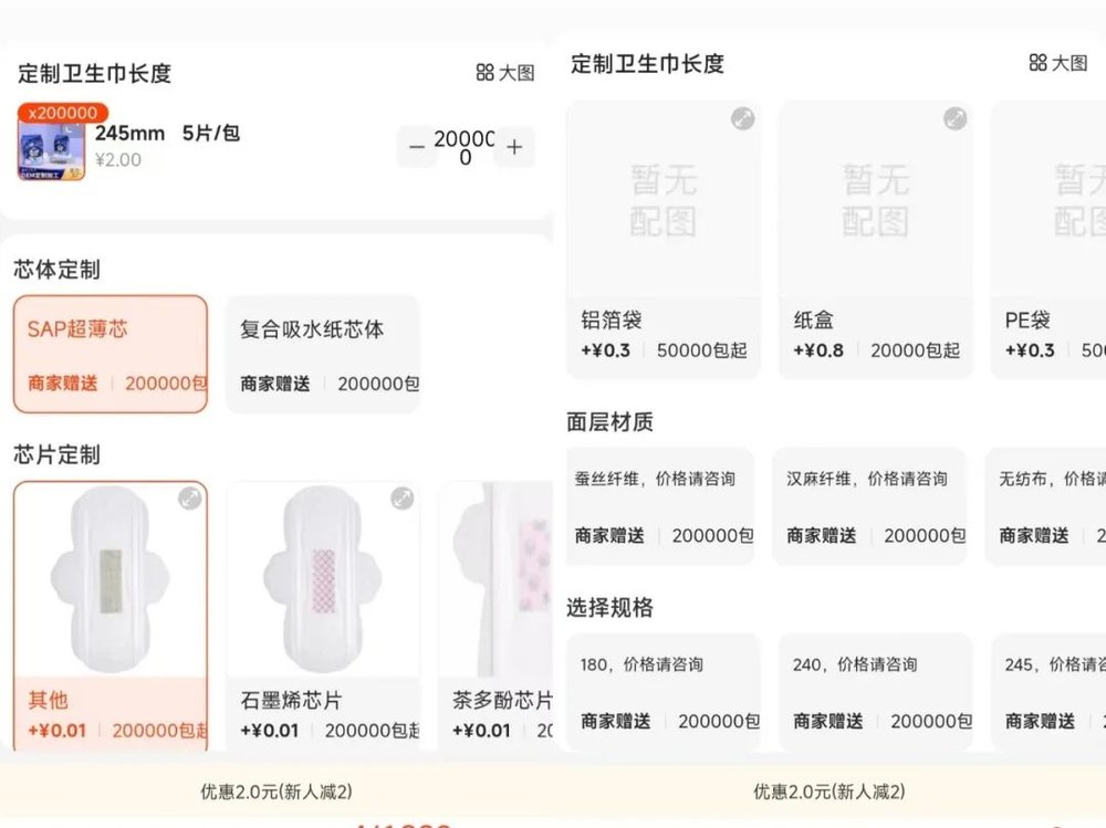 创业者只需要选好代工厂,将需求和logo设计方案提交给代工厂,便可坐等收货。剁椒Spicy在1688上观察到,这些卫生巾代工厂已经有一套成熟的流程化采购模式。“一个规格二十万片起订”,一位卫生巾代工厂商家表示,以245mm日用款规格为例,可选芯体包含了SAP超薄芯、复合吸水纸芯体两种,此外还提供石墨烯、茶多酚、绿波纹芯片作为定制备选,每片需要额外支付1分钱;面层材料也有多种选择,热风布、PLA聚乳酸、竹纤维、纯棉、纱布、蚕丝纤维、无纺布等。
