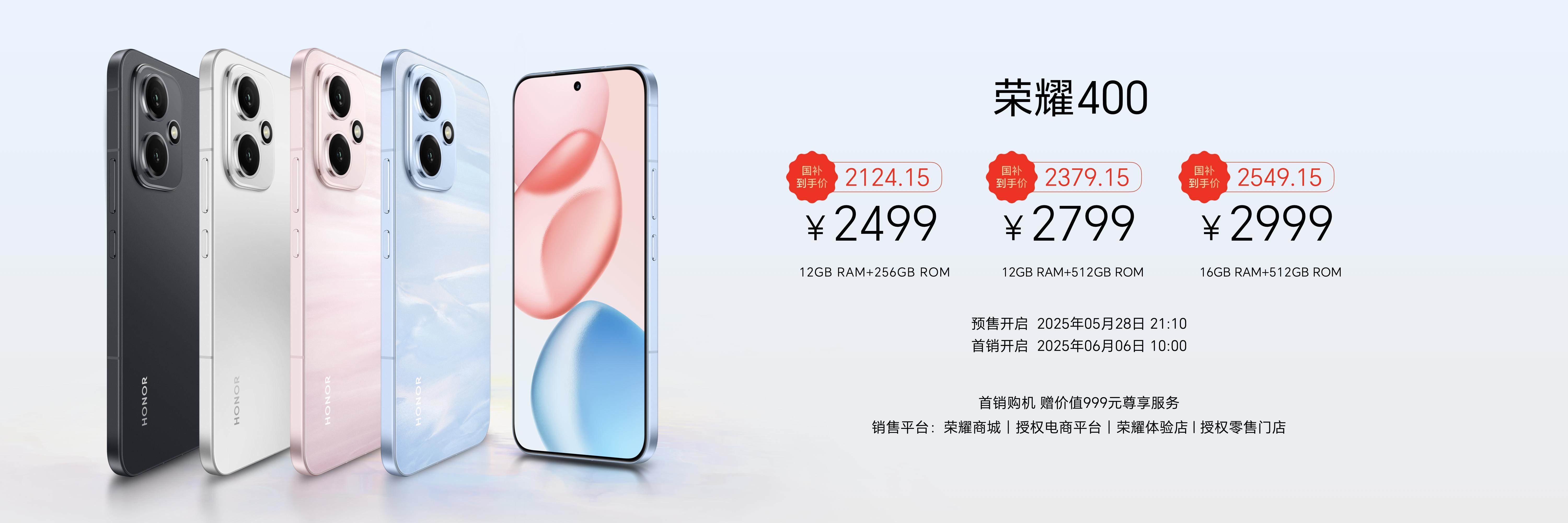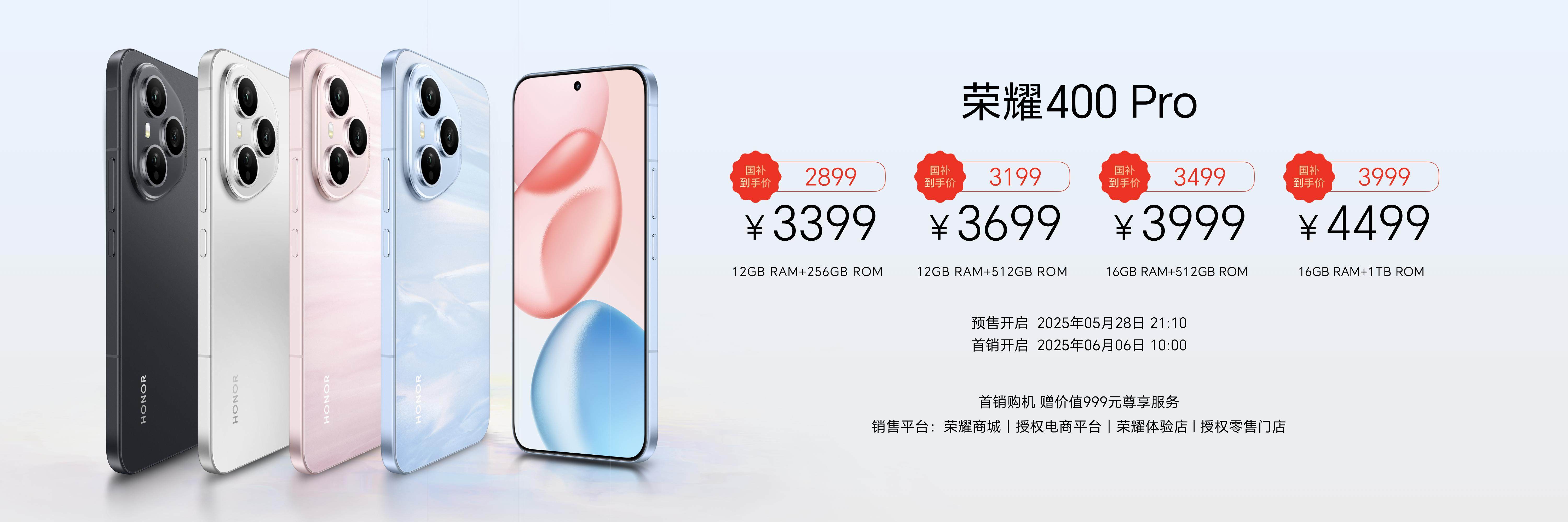 荣耀400系列现已在荣耀商城、授权电商平台、荣耀体验店、授权零售门店开启预售,并于6月6日10:00正式开售,共带来海风蓝、流沙粉、揽月银、幻夜黑4款配色,售价方面,荣耀400标准版12GB+256GB、12GB+512GB和16GB+512GB版本售价分别为2499元、2799元和2999元,国补后售价分别为2124.15元、2379.15元和2549.15元;荣耀400 Pro版12GB+256GB、12GB+512GB、16GB+512GB和16GB+1TB版本售价分别为3399元、3699元、3999元和4499元,国补后售价分别为2899元、3199元、3499元和3999元。
