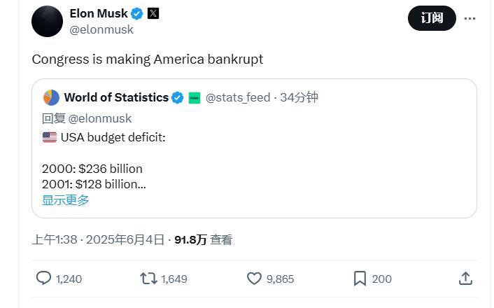 马斯克转发了上面这条高赞评论,并评论称:美国“国会在让美国破产”。
